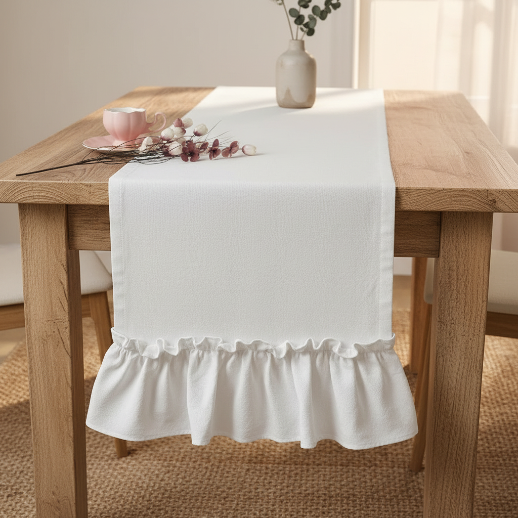 Elevate your dining space with a touch of timeless elegance. Our ruffled table runner combines the rustic charm of natural textures with a delicate, romantic silhouette. The crisp fabric features a subtle, high-quality weave that drapes beautifully over wooden surfaces, making it the perfect centerpiece for both everyday meals and special gatherings.